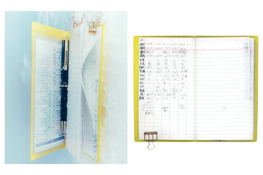 サーモメーターで気温を図り、それをペンでノートに記すという一連の動きをスムーズにできるよう、工夫されたノートブック。夫の淳さんが里奈さんのために作ってくれたものを、大切に使っている。