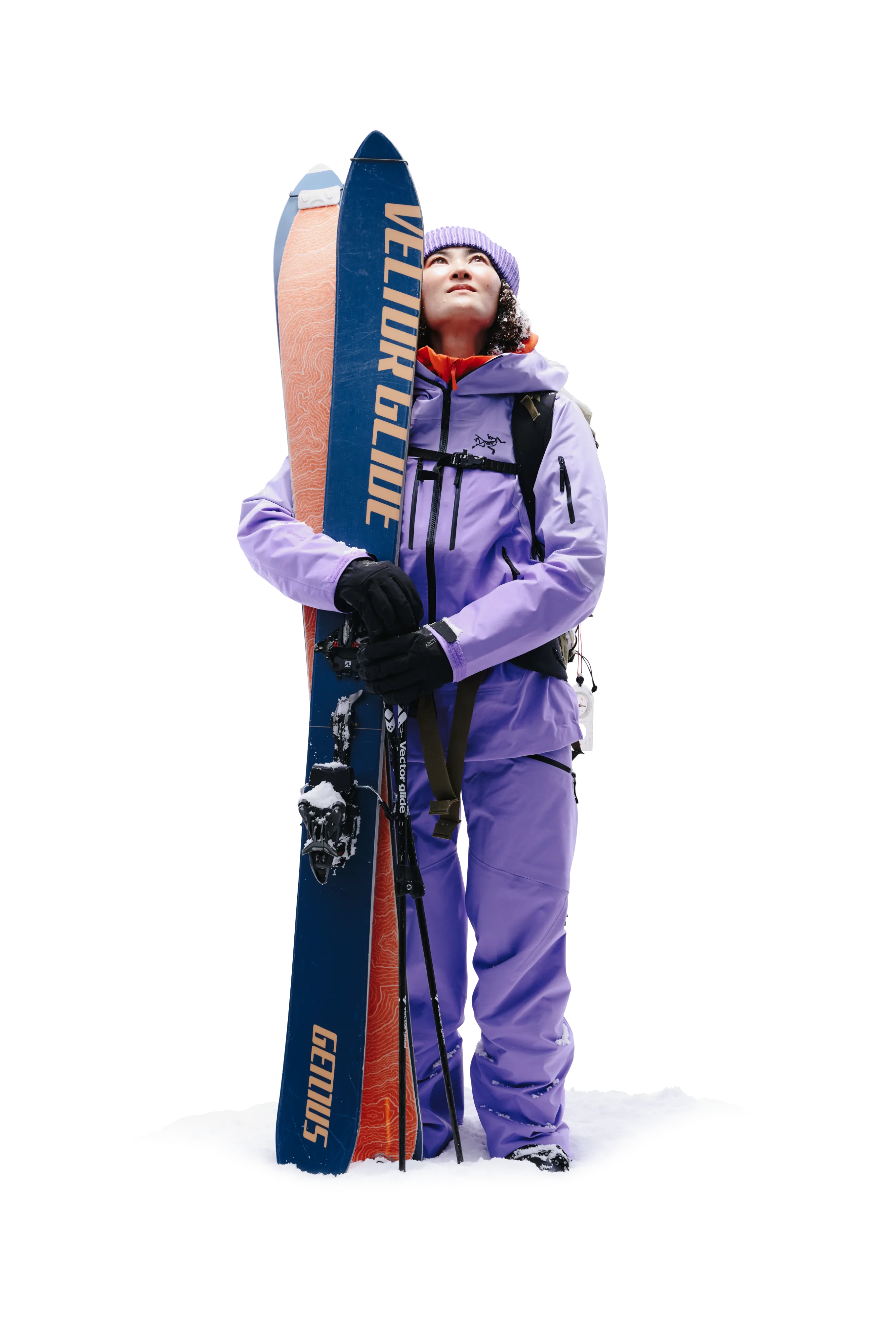 バックカントリースキー/スノーボードに最適な、ツーリングに特化した耐久軽量ウィメンズジャケット。ガイド中にノートなどを頻繁に出し入れするため、バックバックを背負っていても開閉できるポケットの位置が気に入っている。